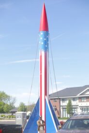 Standing prominently on the east side of Springville Main Street, just before the road splits into U.S. 89 and South State Street, is a rocket-shaped structure painted in patriotic colors.
