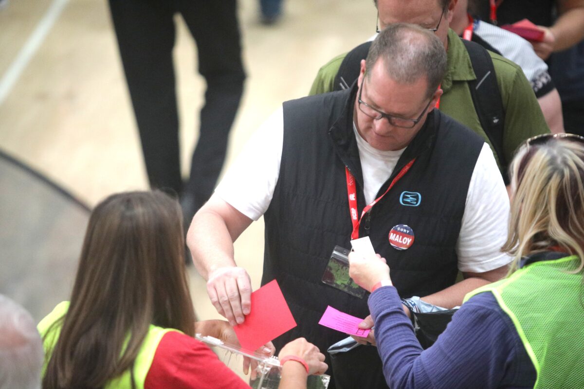 Delegates vote at Utah County Republican Convention Saturday, April 18, 2026, in Lehi.