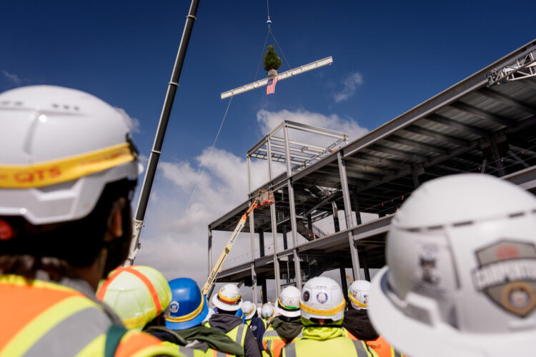 A steel beam is hoisted into place during the “topping out” ceremony of the new QTS data center in Eagle Mountain on Friday, April 17, 2026.The bones of a 193-acre data center campus in Eagle Mountain are ready after developers placed the project’s last beam on Friday in an event crowded by the about 2,000 construction workers employed at the site.