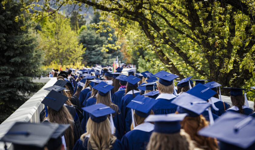 Brigham Young University graduates walk to commencement Thursday, April 24, 2025, in Provo.Brigham Young University’s 150th school year concluded with the 2026 commencement Thursday morning at the Marriott Center, where degrees were conferred upon 6,864 students.