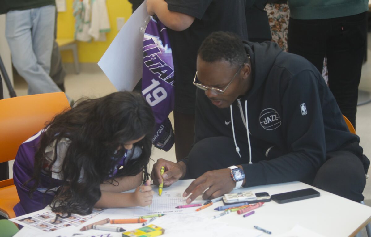 For Williams’ part, he spent much of his time at the foosball table, challenging kids to head-to-head games, then “officiating” matchups between kids. George and Tshiebwe sat and colored Utah Jazz coloring pages with the children.