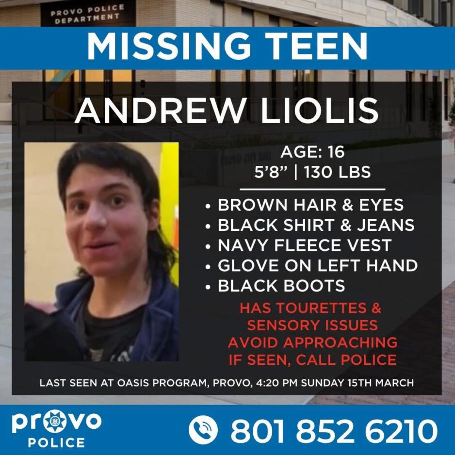 Andrew Liolis was reported missing by Provo police after he was last accounted for at the Oasis Program in Provo on Sunday at 4:20 p.m. Springville police reported Tuesday that he was spotted in the Springville area of 1150 N. and 600 East Tuesday morning.