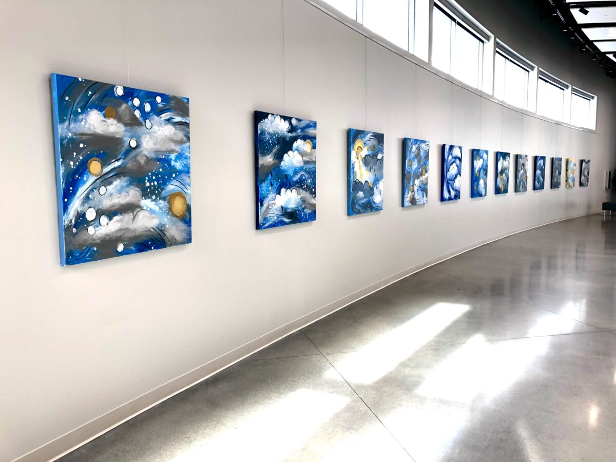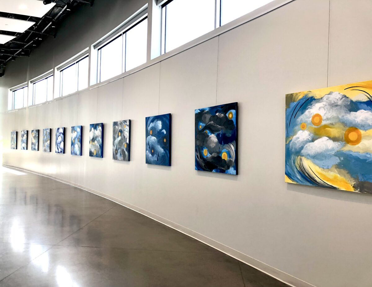 “Each day in 2021, I carefully observed and documented the skies and weather patterns. I then juxtaposed the weather I had observed for each day onto a single canvas. Each individual painting depicts a culmination of the skies for that given month,” she said.