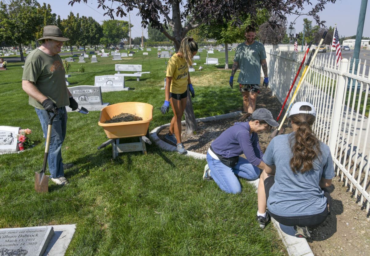 - Volunteers work in the Lehi cemetery in this undated photo.