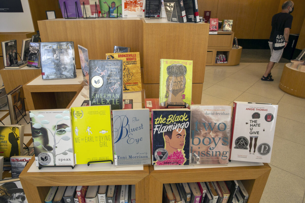 Banned books are visible at the Central Library, a branch of the Brooklyn Public Library system, in New York City on July 7, 2022. The books are banned in several public schools and libraries in the U.S., but young people can read digital versions from anywhere through the library. The Brooklyn Public Library offers free membership to anyone in the U.S. aged 13 to 21 who wants to check out and read books digitally in response to the nationwide wave of book censorship and restrictions.