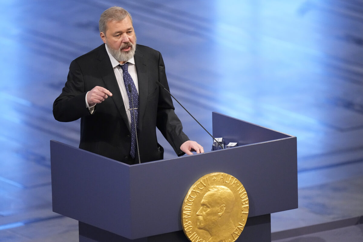 - Nobel Peace Prize winner Dmitry Muratov from Russia speaks during the Nobel Peace Prize ceremony at Oslo City Hall, Norway, Friday, Dec. 10, 2021.