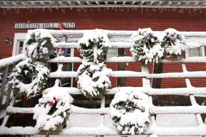 - Christmas wreaths laden with freshly fallen snow are displayed for sale at Boston Hill Farm, Wednesday, Dec. 11, 2019, in North Andover, Mass.