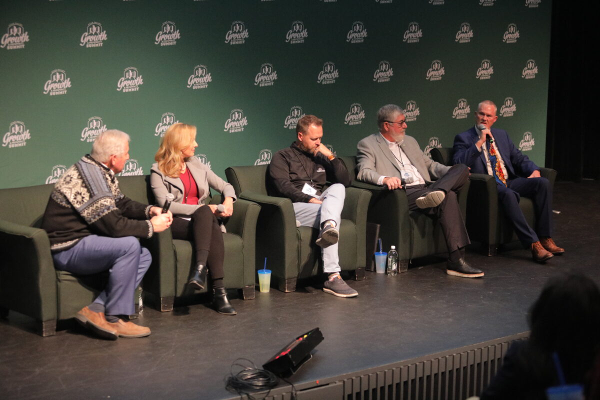 From left, UTA trustee and moderator Jeff Acerson, Lindon Mayor Carolyn Lundberg, Spanish Fork Mayor Mike Mendenhall, Lehi Mayor Mark Johnson and Eagle Mountain Mayor Tom Westmoreland participate in a panel of Utah County mayors during the Growth & Prosperity Summit at Utah Valley University in Orem on Thursday, Oct. 27, 2022.