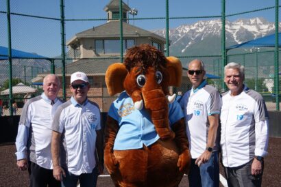 - From left, Orem City Council member David Spencer, Mayor Dave Young, Mero the elephant, Council member Jeff Lambson and County Commissioner Tom Sakievich pose for a photo at the reopening of the Lakeside Ball Fields on Wednesday, June 21, 2023.