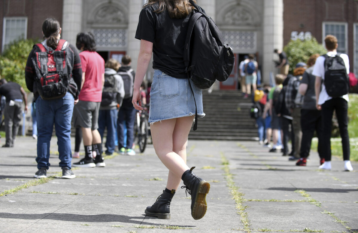 - Students arrive at Benson High School during Portland Public Schools first day of hybrid instruction for middle and high schools, Apr. 19, 2021, in Portland, Ore.