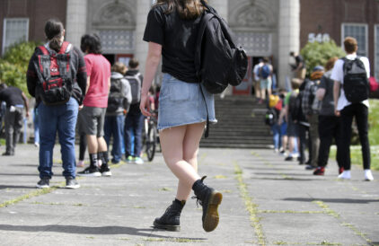Students arrive at Benson High School during Portland Public Schools first day of hybrid instruction for middle and high schools, Apr. 19, 2021, in Portland, Ore.