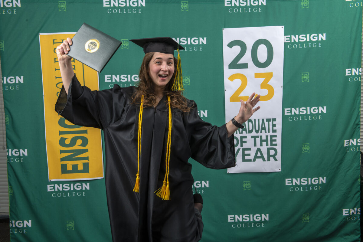 Kristina, an international student from Russia, poses after graduating from Ensign University. Kristina earned her degree with help from the Climb Foundation.