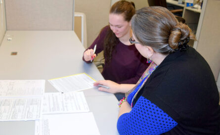 - A volunteer helps a community member file their taxes through the VITA program.