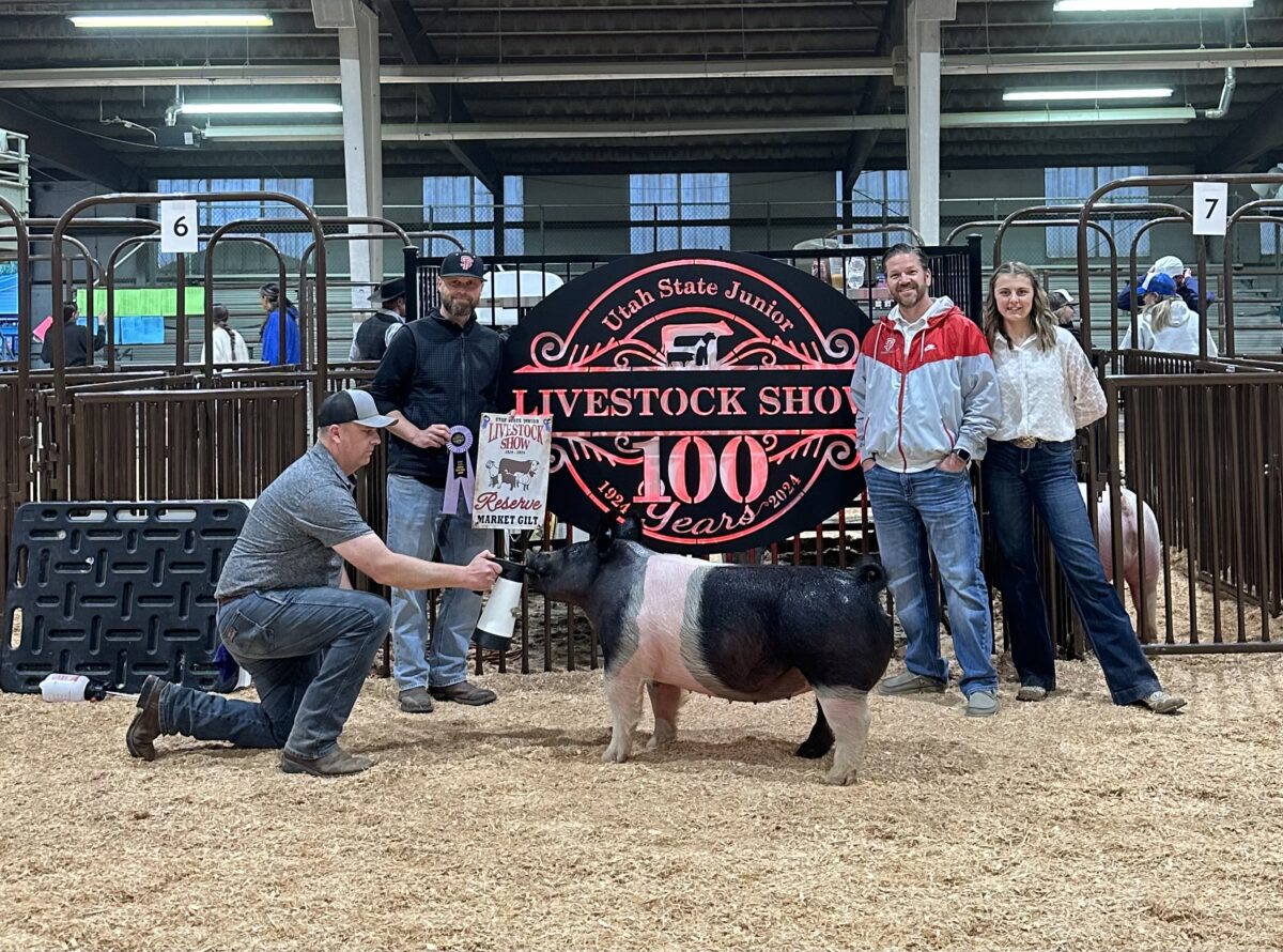 - Spanish Fork Mayor Mike Mendenhall, center, poses with others during the 2024 Utah State Junior Livestock Show.