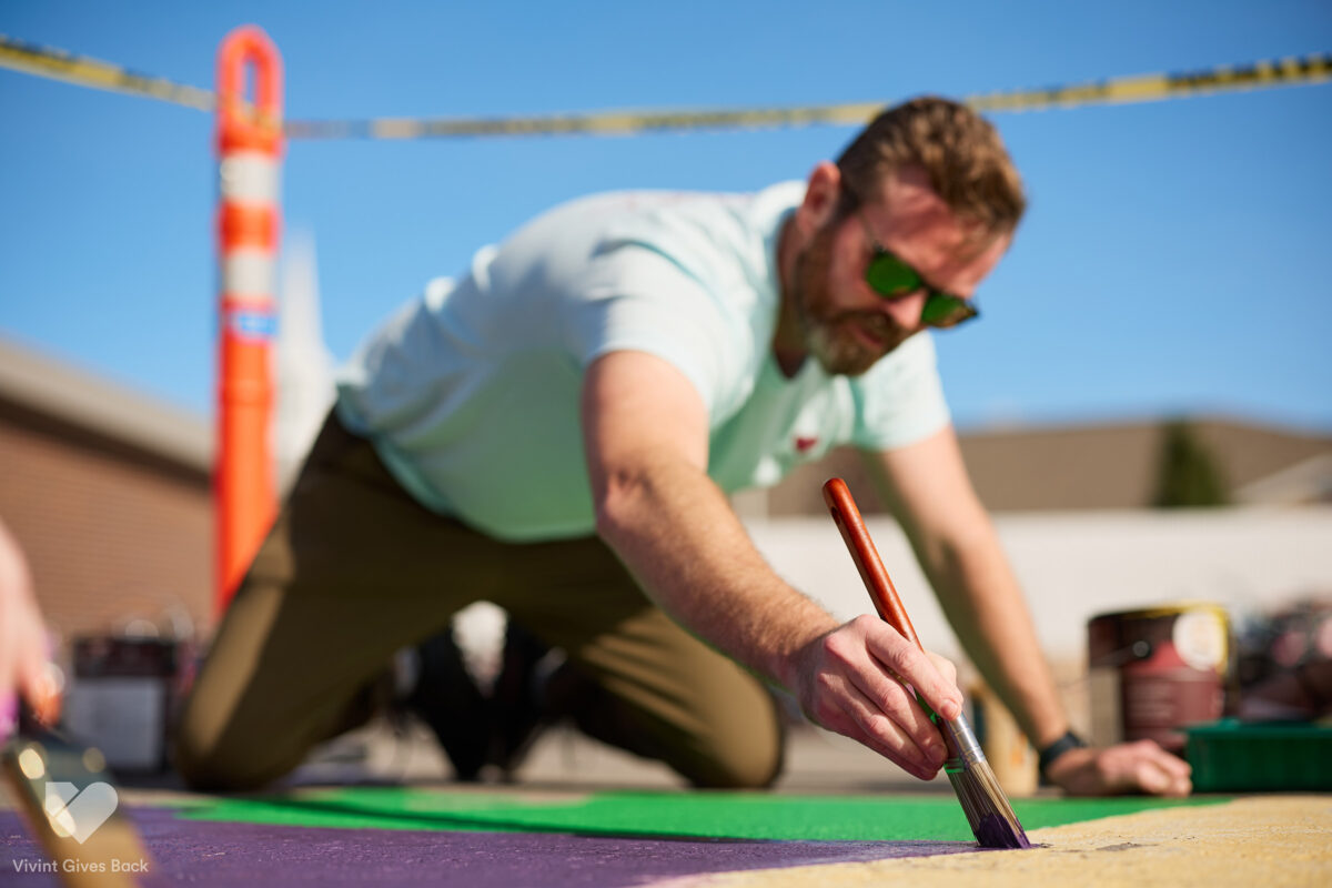 - A volunteer paints playground games at a school as part of a United Way 2024 Day of Caring project.