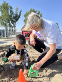 - A volunteer plays with a child as part of a United Way 2024 Day of Caring project.