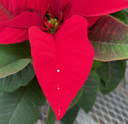 My poinsettia had a few spots of white sap on one of the red leaves. When I wiped off the sap, it just made the leaf look worse. How can I fix this if it happens again?