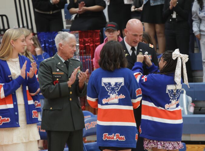 Knight was honored in front of the Timpview High School student body Tuesday by students Magdalena Leyton Lara and Stefany Suero, ...