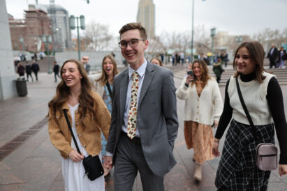 - A couple walks near Temple Square in Salt Lake City during general conference weekend, April 1-2, 2023.