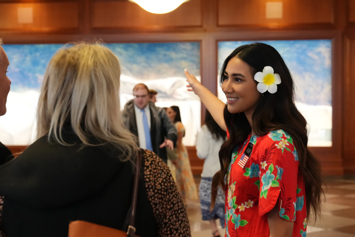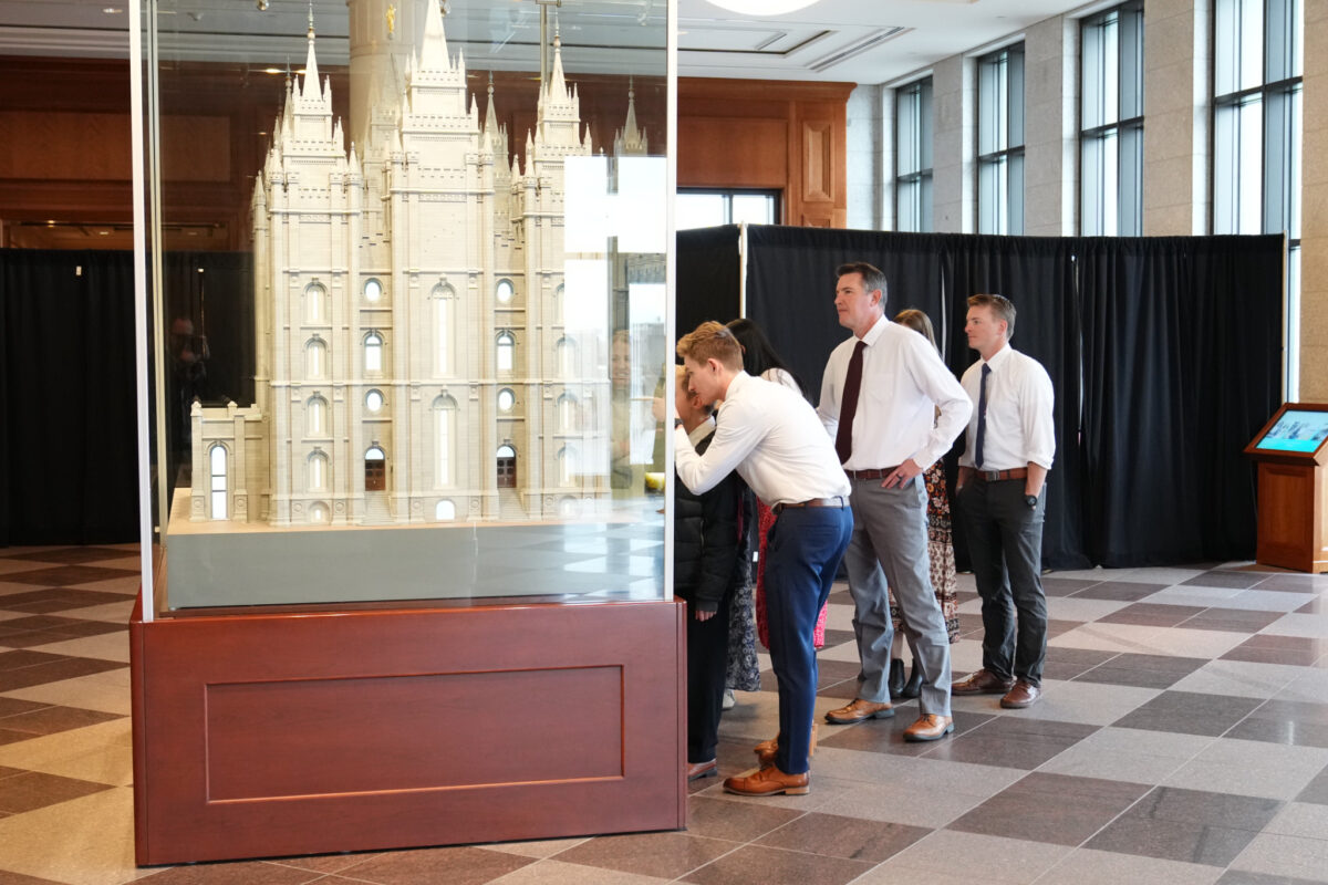 - A missionary guides conferencegoers prior to the morning session of general conference in the Conference Center on Temple Square in Salt Lake City on Sunday, April 2, 2023.