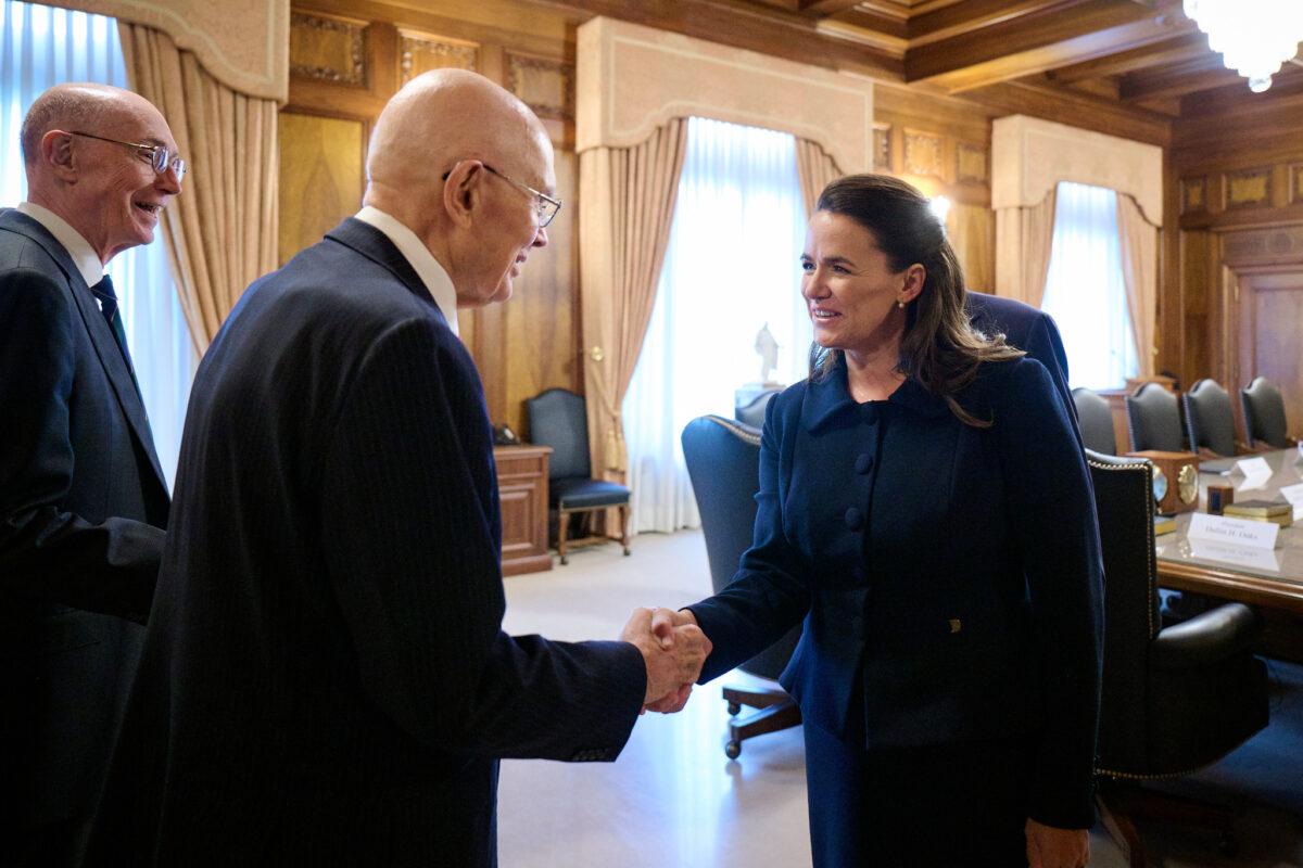 - President Dallin H. Oaks of the First Presidency shakes the hand of Hungarian President Katalin Novák during a visit at the Church Administration Building on Temple Square in Salt Lake City on Tuesday, Sept. 26, 2023.