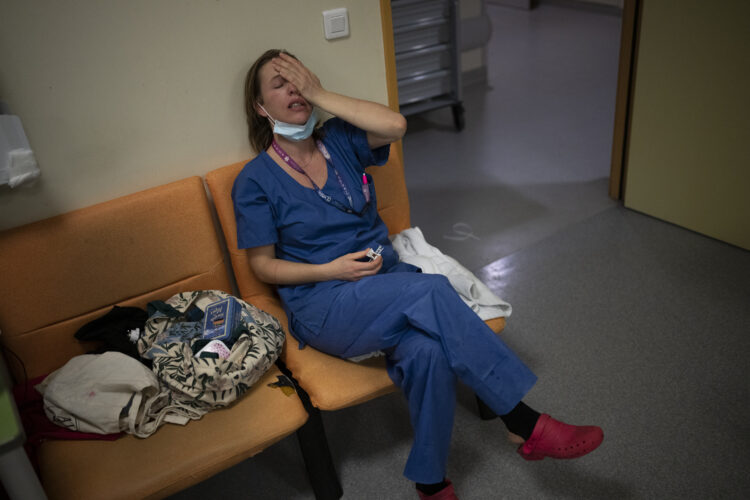 Nurse Marie-Laure Satta caresses her face during a pause in her New Year's Eve shift in the COVID-19 intensive care unit at the la Timone hospital in Marseille, southern France, Friday, Dec. 31, 2021.The nursing shortage in Utah is a major problem, health professionals say, and while it stems long before COVID-19 hit in 2020, the pandemic made things even worse.