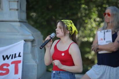 Kaylee Reinitz, another organizer and member of the Party for Socialism and Liberation, addressed the crowd to share the three goals of the day’s protest.