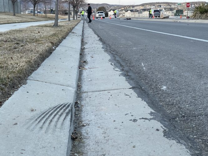 Curb scuffs are shown near the site of a crash that killed 19-year-old Caelan Lewis in Eagle Mountain on Friday, March 18, 2022.Early Friday evening, a 19-year-old Eagle Mountain resident was killed in a crash at the intersection of Porter’s Crossing and Evans Ranch Drive. Utah County Sheriff’s deputies reported to the scene, where a 14-year-old driving a dirt bike on the streets reportedly hit and killed the pedestrian.