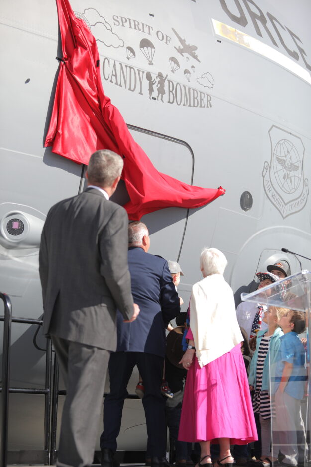 - Members of the Halvorsen family and others unveil the “Spirit of the Candy Bomber” design placed on an active C-17 aircraft at the Provo Airport on Friday, May 20, 2022.