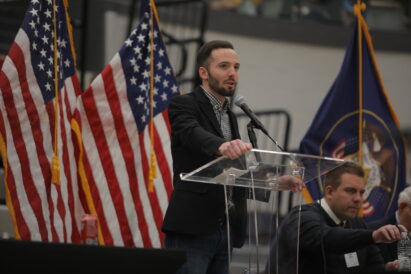 - Jake Hunsaker addresses delegates during the Utah County GOP Convention at Cedar Hills High School on April 9, 2022.