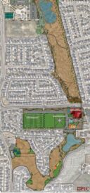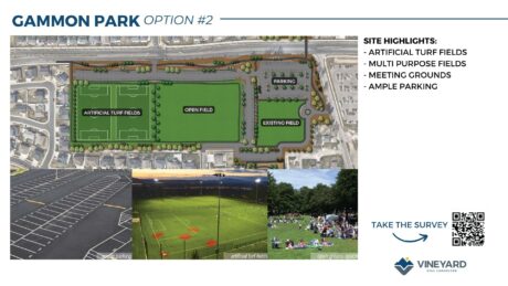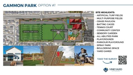 Gammon Park has two designs for residents to consider. The first design includes artificial turf fields and multi-purpose fields, with batting cages, a tennis court, a community center, sensory garden, all-abilities park, playgrounds, a parkour playground, spray park, bouldering space and a spot for yard games also available.