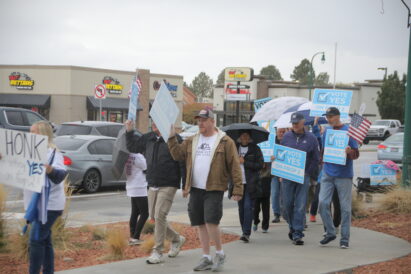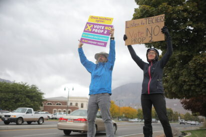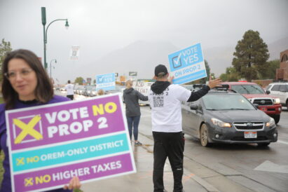From 10-11 a.m., groups of people opposed to Proposition 2, a ballot measure regarding the potential formation of an Orem City School District, lined street corners urging passersby to honk for support. From 11 a.m. until noon, supporters of the proposition followed suit from the same spots, lining Center Street and State Street in spite of the rain and wind.