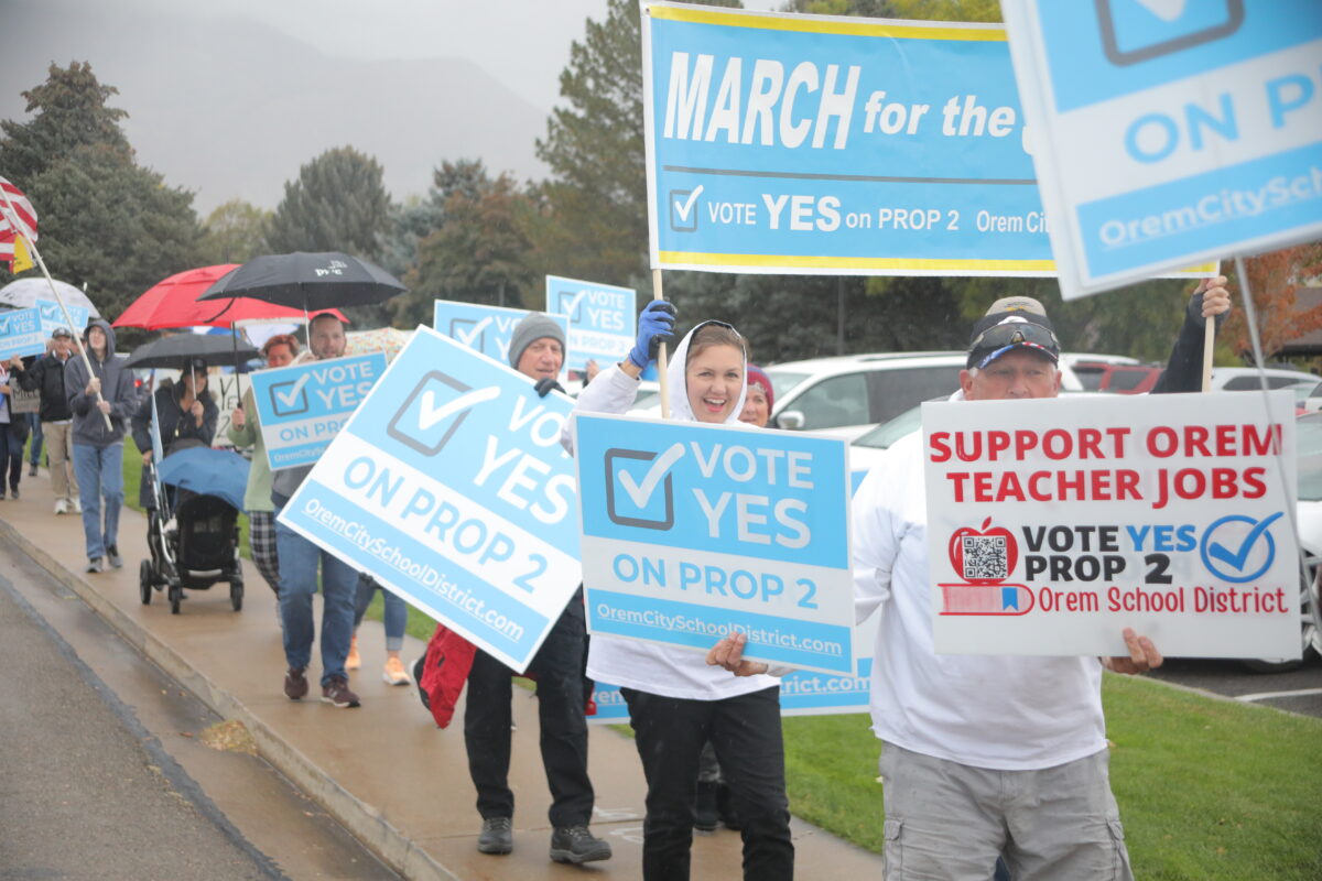 - Demonstrators supporting Proposition 2 hold signs to get the attention of drivers as they march toward the intersection of Center Street and State Street in Orem on Saturday, Oct. 22, 2022.