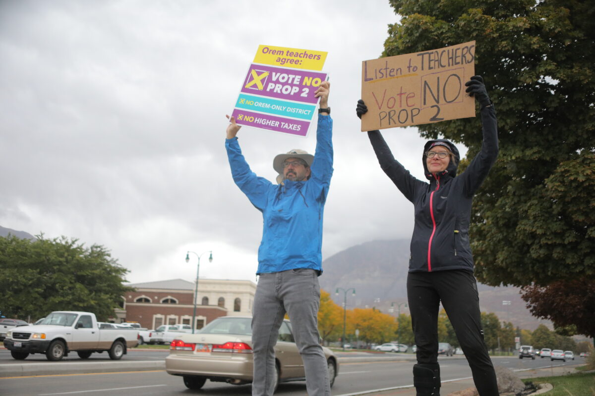 - Timpanogos High School teacher Michael Nagro and Utah Valley University professor Kate McPherson holds signs in opposition to Proposition 2 at the intersection of Center Street and State Street in Orem on Saturday, Oct. 22, 2022.