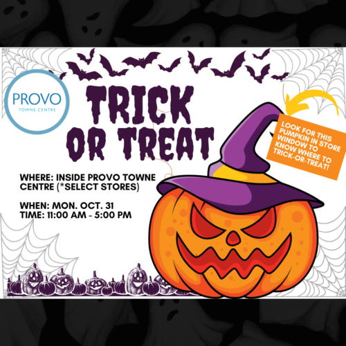 Provo Towne Centre stores are participating in indoor trick-or-treating beginning at 11 a.m. Shoppers are invited to look for stores with a pumpkin in their front windows to know who they can trick-or-treat to.