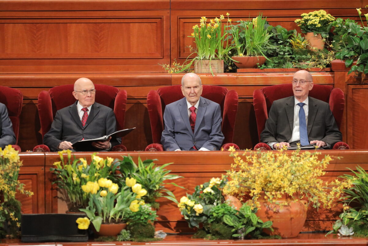 - From left, first counselor Dallin H. Oaks, President Russell M. Nelson and second counselor Henry B. Eyring wait for the the morning session of the 193rd Semiannual General Conference of The Church of Jesus Christ of Latter-day Saints to begin at the conference center in Salt Lake City on Saturday, April 1, 2023.