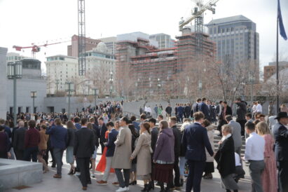 - People wait in line to enter the 193rd Semiannual General Conference of The Church of Jesus Christ of Latter-day Saints in Salt Lake City on Saturday, April 1, 2023. Behind is the under-construction Salt Lake Temple.