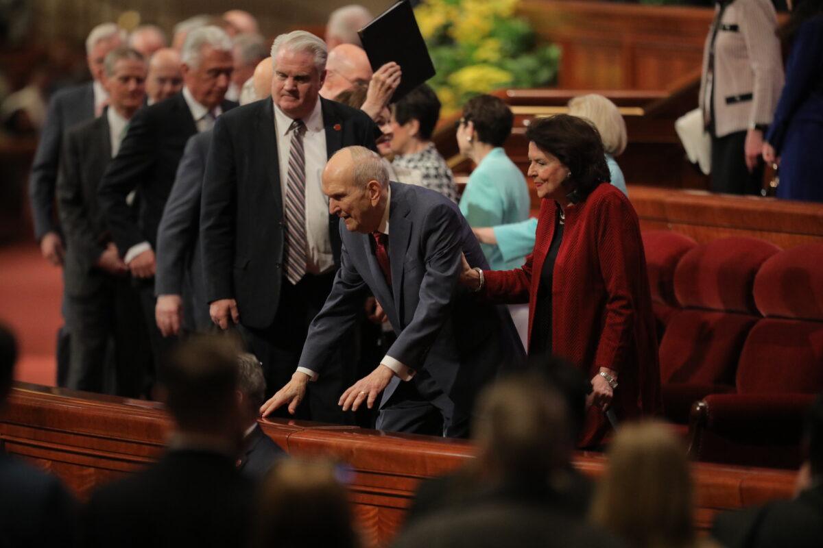 - President Russell M. Nelson and his wife Wendy Nelson great conference attendees to conclude the morning session of the 193rd Semiannual General Conference of The Church of Jesus Christ of Latter-day Saints at the conference center in Salt Lake City on Saturday, April 1, 2023.