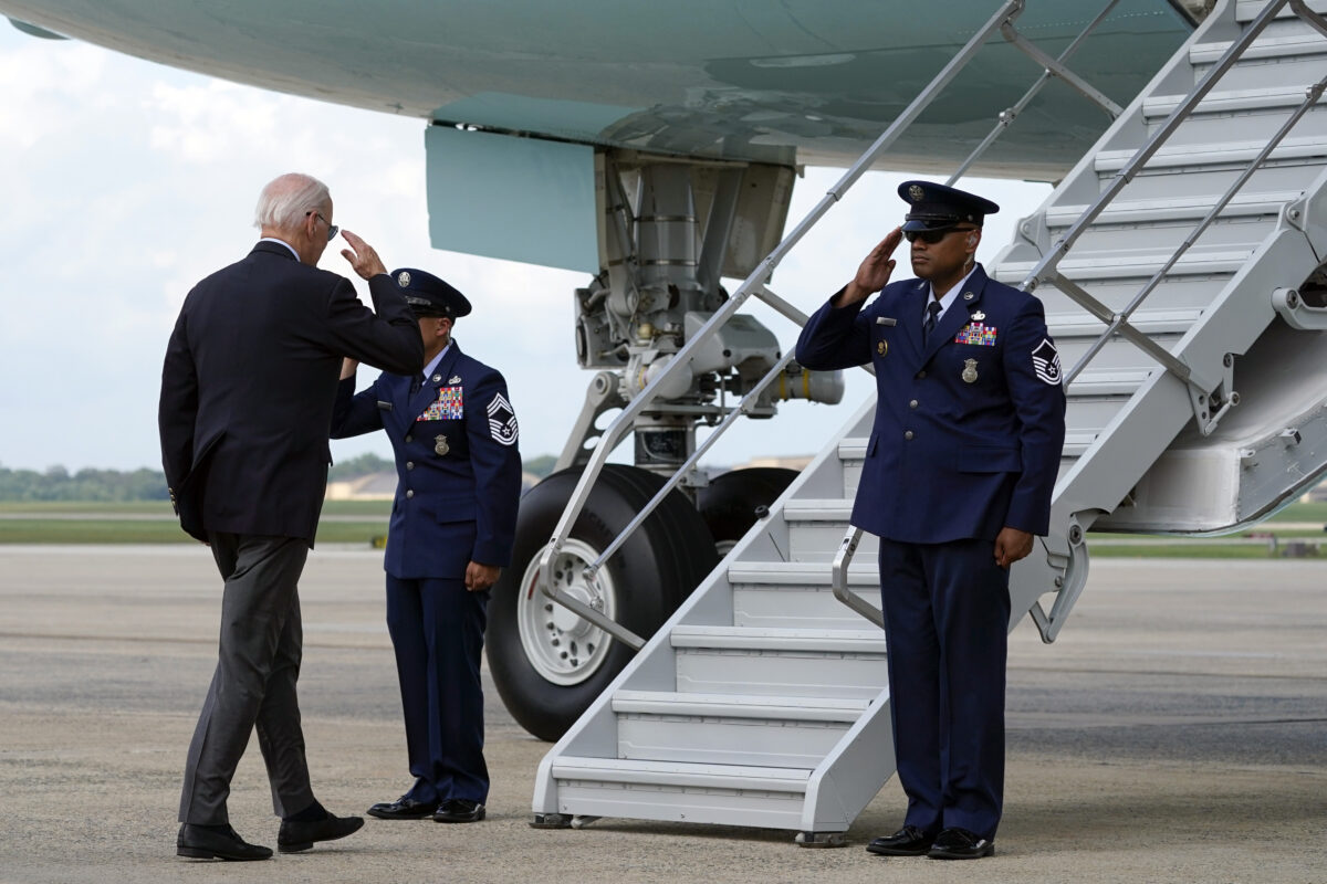 President Joe Biden boards Air Force One upon departure Monday, Aug. 7, 2023, at Andrews Air Force Base, Md. Biden is en route to Arizona, New Mexico and Utah.
