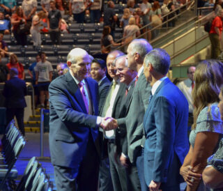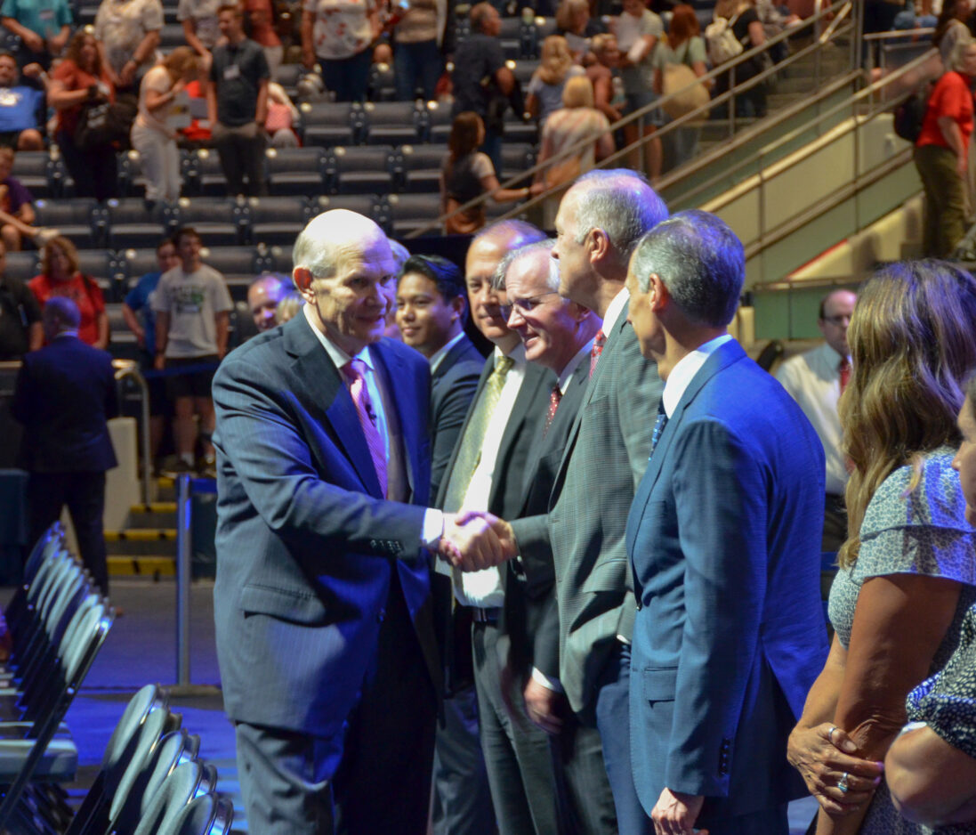 - Elder Dale G. Renlund shakes hands with one of the people attending his devotional for Brigham Young University’s Education Week on Tuesday, Aug. 22, 2023. Renlund shook hands with each of the people sitting on the floor area of the Marriott Center.