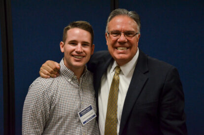 - Brady Schvaneveldt, left, stands next to Bradley Wilcox after Wilcox and Tamara W. Runia gave a devotional for BYU Education Week on Thursday, Aug. 24, 2023.