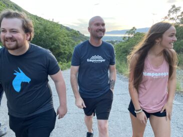 - Joe Vogel, center, of Timpanogos Hiking Co. and employees Kai Bradford and Delaney Sell.