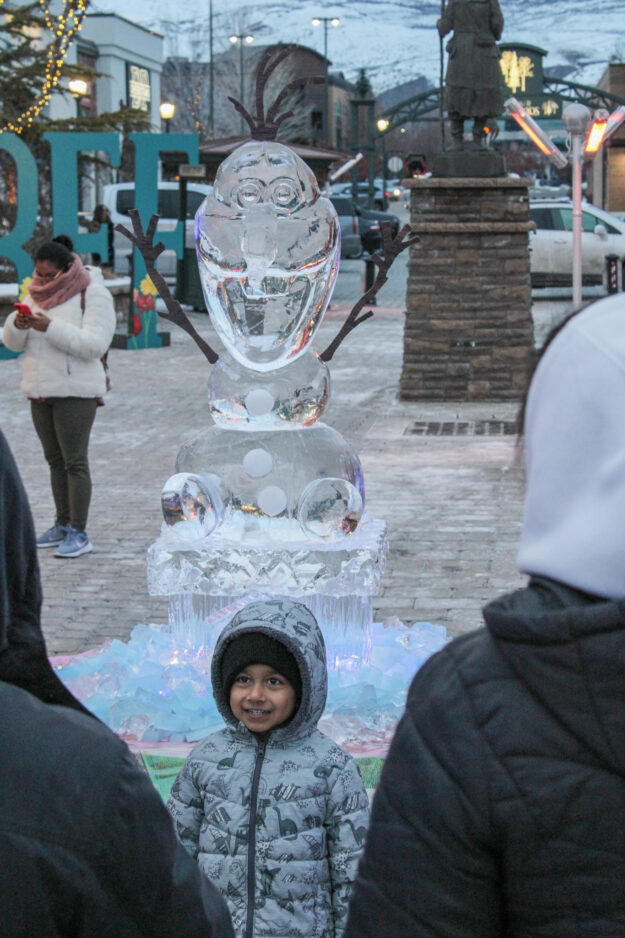 - A child poses for a photo taken by his mother in front of an ice sculpture of Disney’s Olaf the snowman, which is displayed at the Fire and Ice Festival held at The Shops at Riverwoods in Provo on Friday, Feb. 3, 2023.