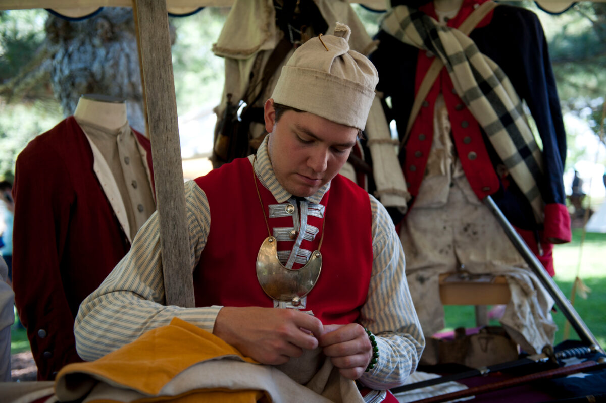 - Skyler Pinales sews a uniform at America’s Freedom Festival’s Colonial Heritage at SCERA Park in Orem, July 5, 2014.