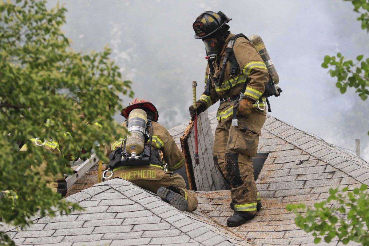 Firefighters remove a portion of the roof on one of the two houses that were burned during a two house structure fire on Friday, May 18, 2018, in Provo.