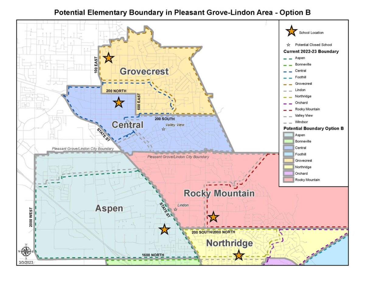 - This map, published on Feb. 28, 2023, shows a second set of potential elementary school boundaries for the Pleasant Grove and Lindon areas.