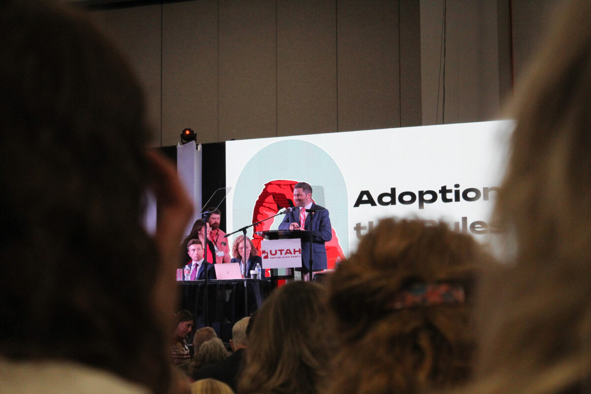 - Delegates watch Utah Republican Party Chair Rob Axson speak at the state GOP convention on Saturday, April 27, 2024.