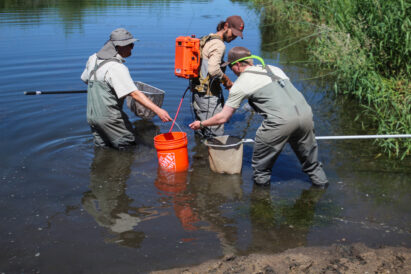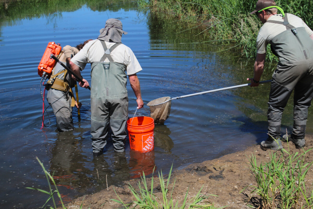 They used an “electrofishing” method, where they used a probe to send an electric current into the water to stun fish for a few seconds while they came behind with a net to scoop up fish and place them in a bucket of water.