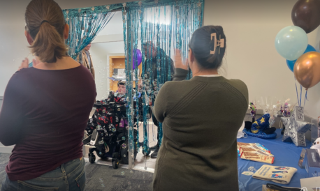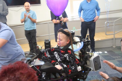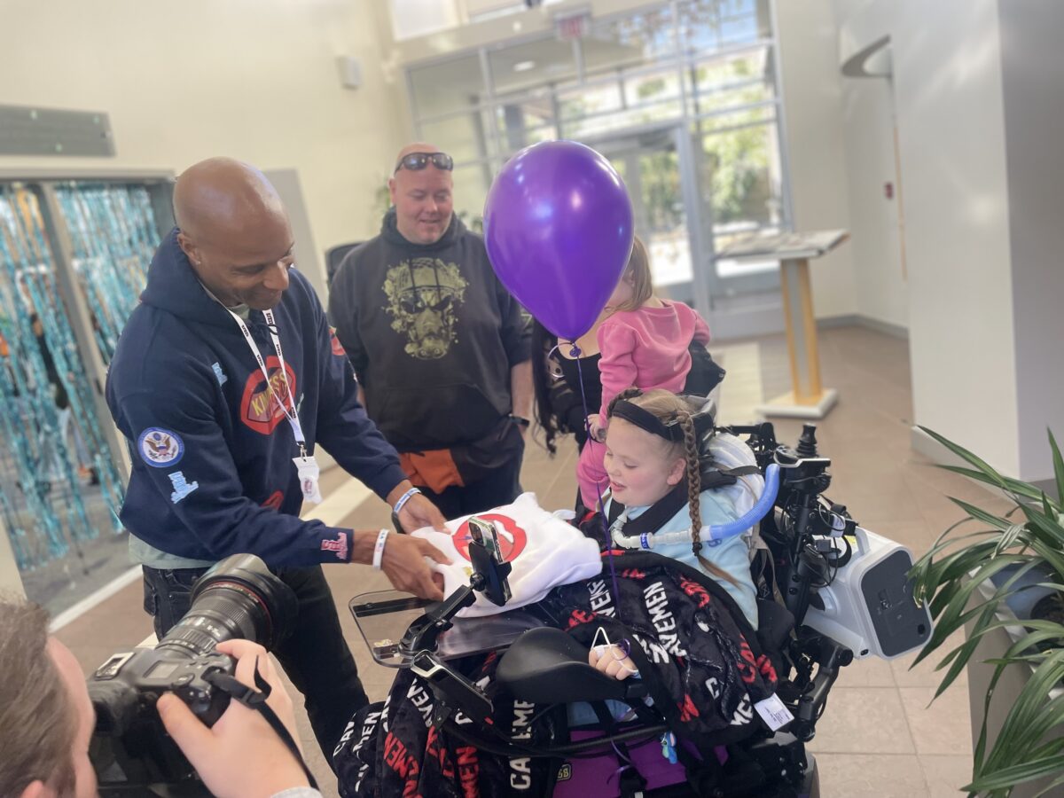 - Sophia Ostler enters a room pushed in her wheelchair by her father, Craig Ostler, during a surprise ceremony Monday, Nov. 11, 2024. Sophia learned that her wish to go to Disney World is being granted.