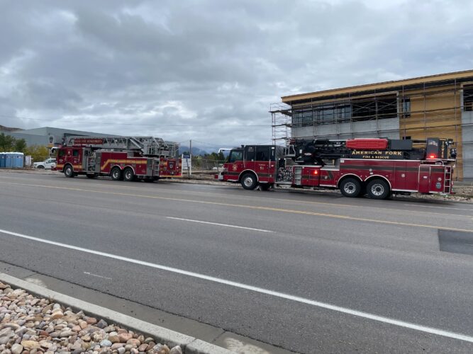 Emergency vehicles are pictured at a Lehi construction worksite where a man was found dead Thursday morning, Oct. 17, 2024.A man was found dead Thursday morning at a Lehi construction worksite on 1200 West near Timpanogos Highway, where his body was pinned against a forklift, the Lehi Fire Department said.